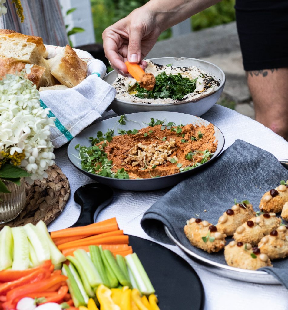 A snack table features a curated selection of small bites, grazing items, and flavorful nibbles designed for casual, shareable enjoyment. Guests can sample a variety of fresh, seasonal, plant-based options at their own pace. Perfect for receptions, cocktail hours, or informal gatherings, we create visually stunning and delicious spreads that invite mingling and conversation.