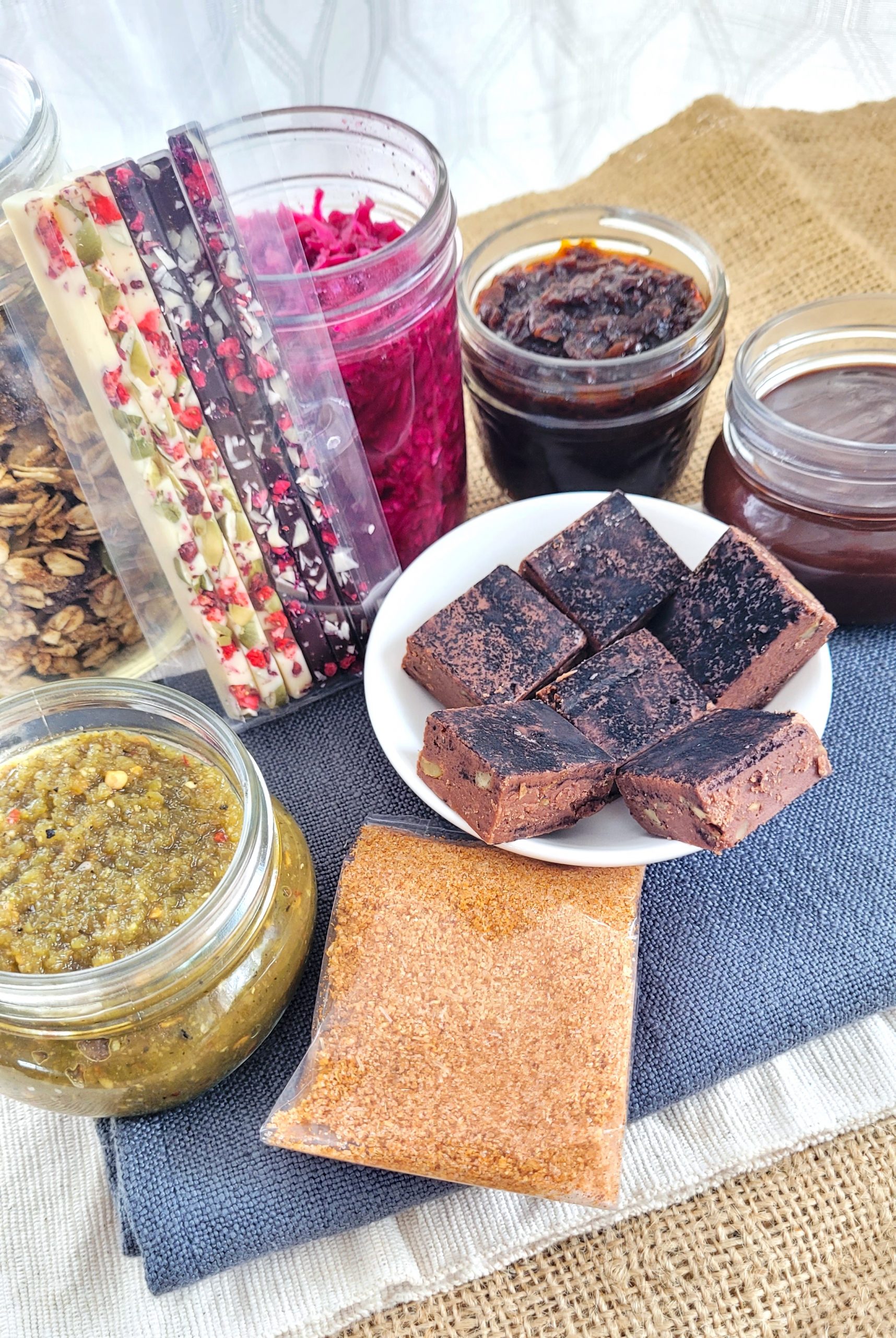 Ce magnifique coffret cadeau renferme de délicieux produits faits maison. À l’intérieur, vous trouverez un assortiment de produits utiles pour vos placards et de gourmandises. Chaque produit est fait d’ingrédients de sources responsables et sans produits animaux.