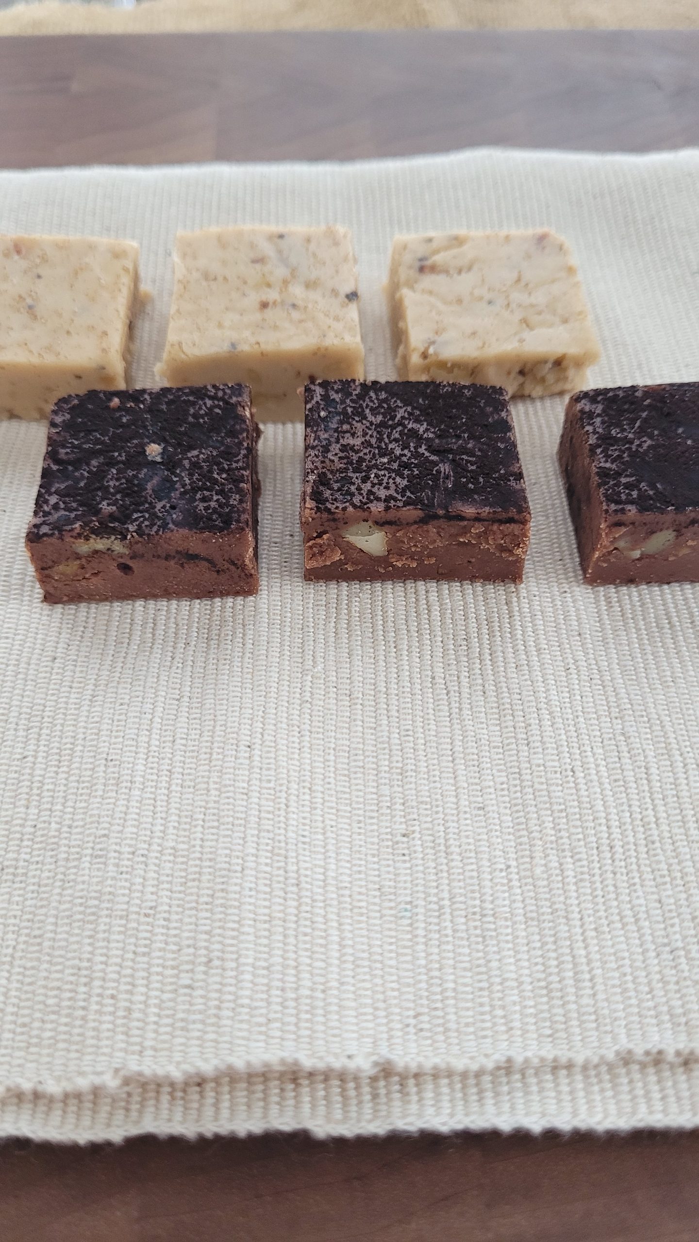 – 3 morceaux de fudge au chocolat noir et aux noix, 3 morceaux de fudge à l’érable fumé