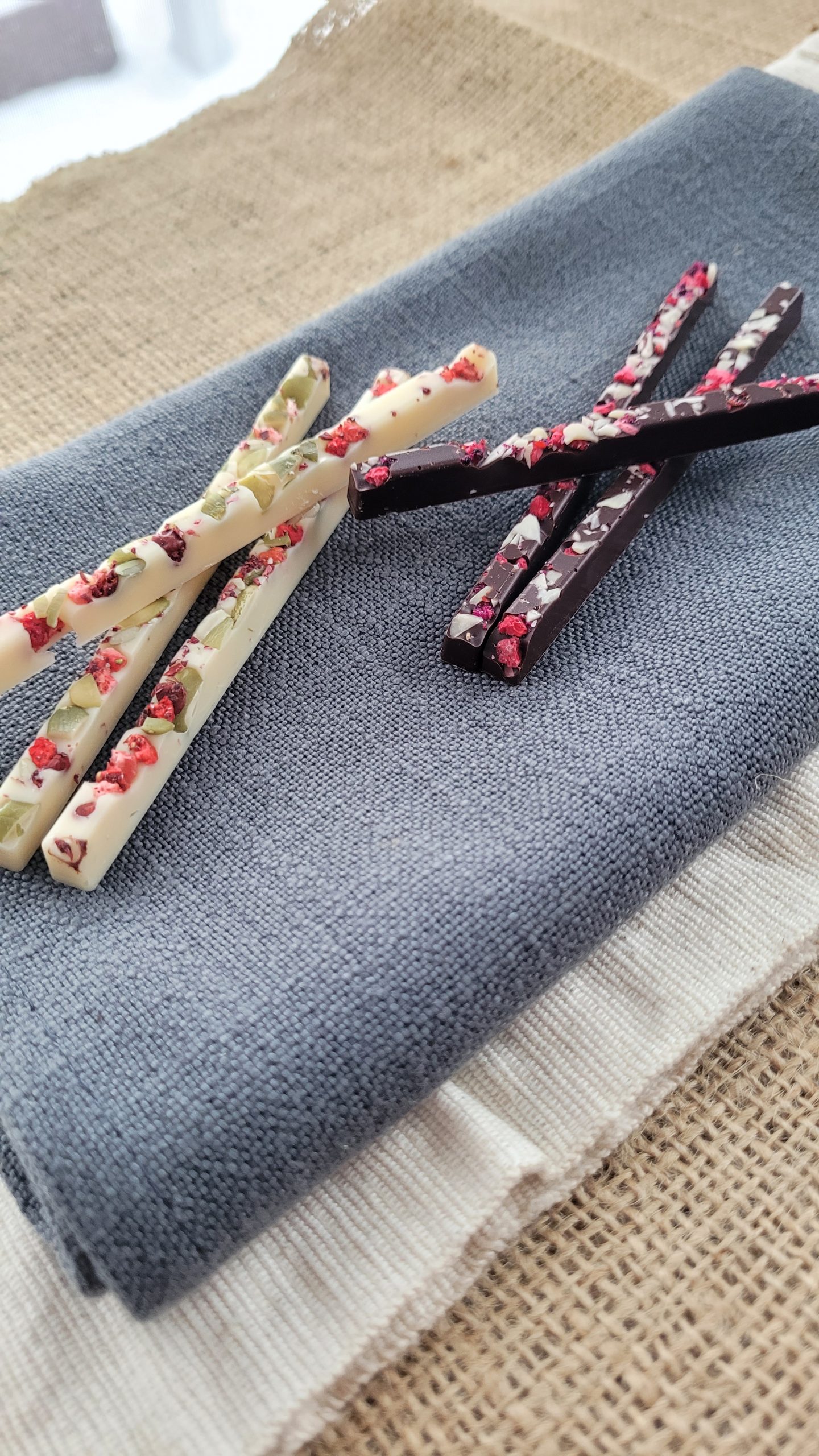 – 3 dark chocolate / pink peppercorn / raspberry chocolates, 3 white chocolate / sumac / strawberry chocolates